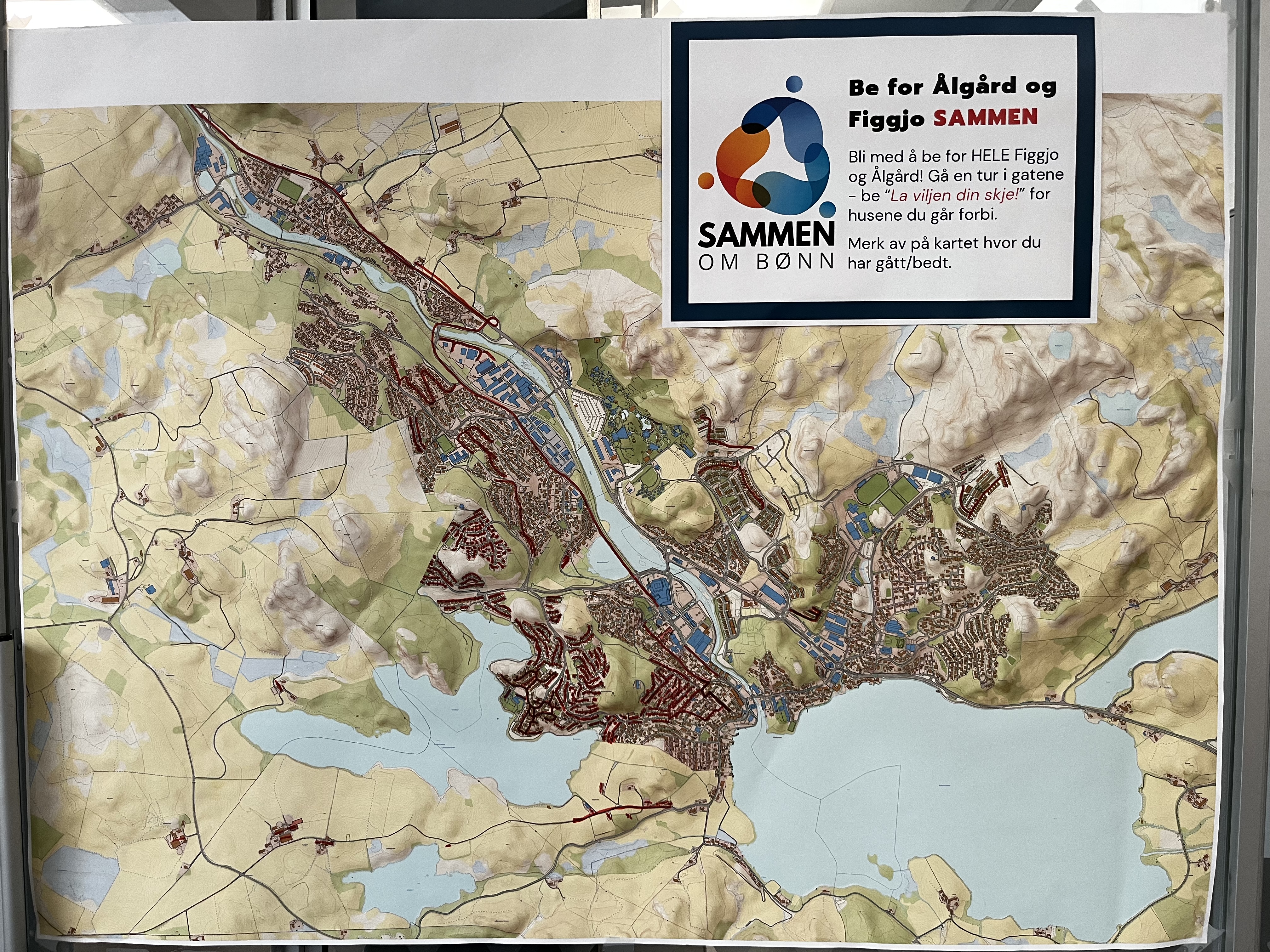 Det henger et kart på kirketorget (oppe i inngangspartiet utenfor kirkerommet) hvor du kan merke av hvor det har blitt bedt i rød tusj. Vi legger ut et oppdateter bilde under så man kan velge seg ut en gate eller nabolag:
